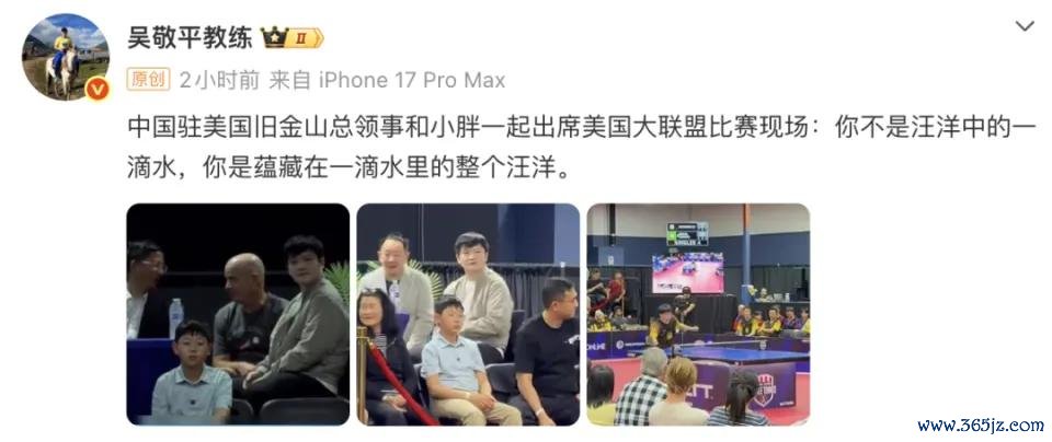 4月21日消息,樊振东以美国职业乒联战略投资人身份现身赛场,还和中国驻旧金山总领事张建敏友好交流,恩师吴敬平发文力挺,称赞他格局开阔,并非渺小水滴,而是藏着整片汪洋。