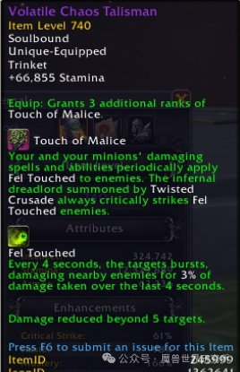 邪能灼烧: 每4秒爆裂一次,对周围敌人造成过去4秒所受伤害的3%。超过5个目标后效果递减。